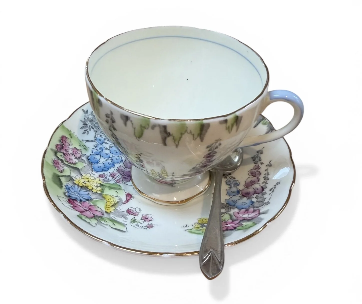 Crafted in the heart of Stoke-on-Trent, this delicate Foley bone china set dates from around the 1950’s. Decorated with soft cottage-garden florals and finished with fine gilt edging, it captures the charm and elegance of traditional English afternoon tea.